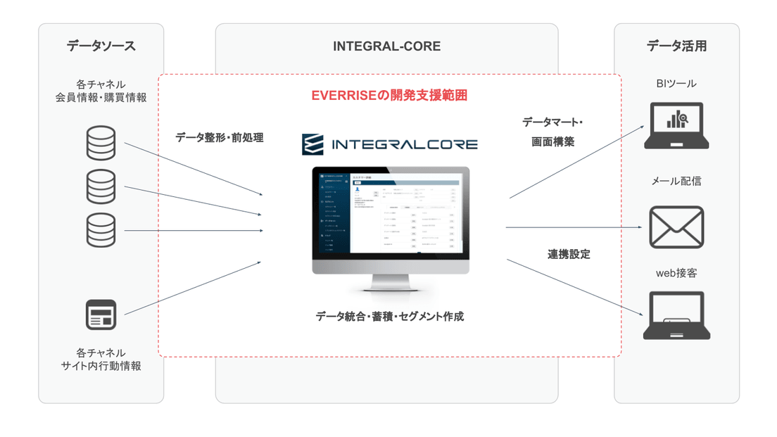 EVERRISEは本プロジェクトにおいて、顧客データ管理のためのCDP「INTEGRAL-CORE」の導入支援を行うとともに、BIツールの構築、メール配信ツール「Synergy!」およびweb接客ツールとの連携支援を実施しました。これにより、チャネルを横断した分析と、顧客に合わせたコミュニケーションの最適化を支援しました。