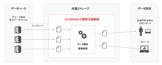 その中でEVERRISEは、実験的に現状のデータの収集と統合を行い、本格的なデータ分析基盤構築時に活かすための簡易的なデータ統合の仕組みを開発支援しました。
